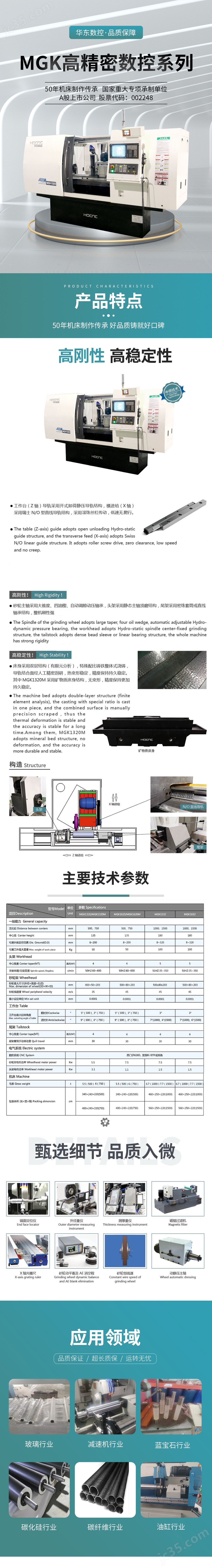 机床整体结构采用工作台移动式 T 型布局,选用开式静压导轨、滚珠丝杆传动;床身采用双层结构(有限元分析),特殊配比铸铁整体式浇筑,导轨结合面经人工精密刮研,热变形小,精度保持持久稳定。适用于磨削圆柱形或圆锥形回转体表面,可两轴插补修整砂轮进行成形磨削,也可进行纵向往复磨削。