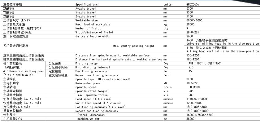 | 详细信息: GMC2060u龙门五面加工心基础件均采用优质高强度铸件,龙门式框架架构,整机具有良好的刚性、抗震性和精度保持性。 X、Y、Z三轴均采用重载滚柱直线导轨,承载大、精度高,X、Y轴均配置丝杠随动辅助支撑,传动精度高,保持性好。 西班牙45°铣头,具有主轴驱动的C轴自动分度与A轴自动分度,分度精度高,切削扭矩大。 可进行直线,斜线和圆弧插补切削,完成铣、镗、钻、扩、铰、攻丝等工序加工,实现五面加工。 特别适用于汽车、航空航天、冶金矿山、机床制造等行业的箱体类零件及杂形零件的加工。 标准配置: FANUC 0i MF 32把链式刀库 45°铣头 进口超级液压单元 选择配置: 西门子828D数控系统 40把链式刀库 自动排屑系统 |