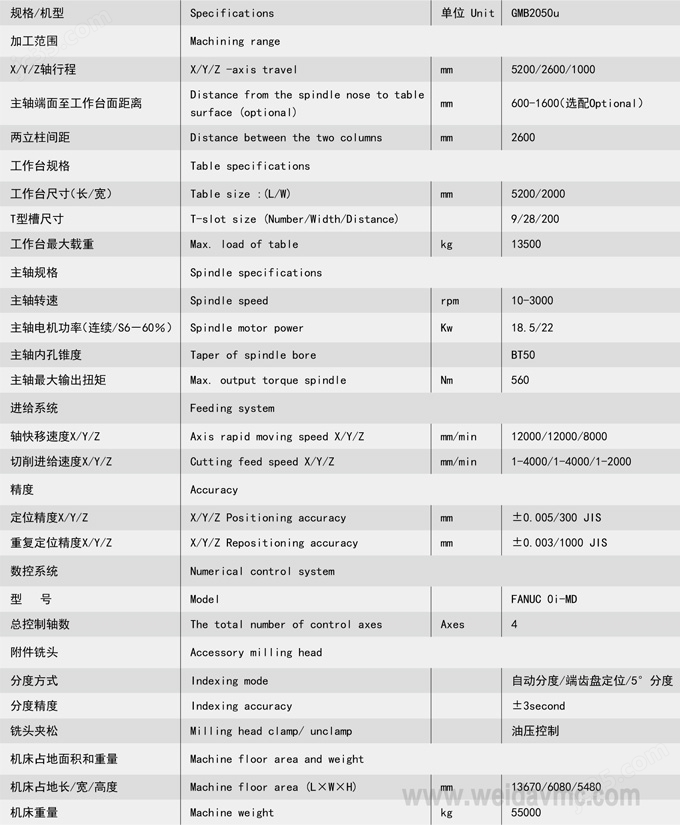 GMB2050u技术指标和配置,产品结构和工艺成熟,产品质量稳定。适用于汽车、航空航天、印刷、包装、纺织、、模具等各种机械加工领域。